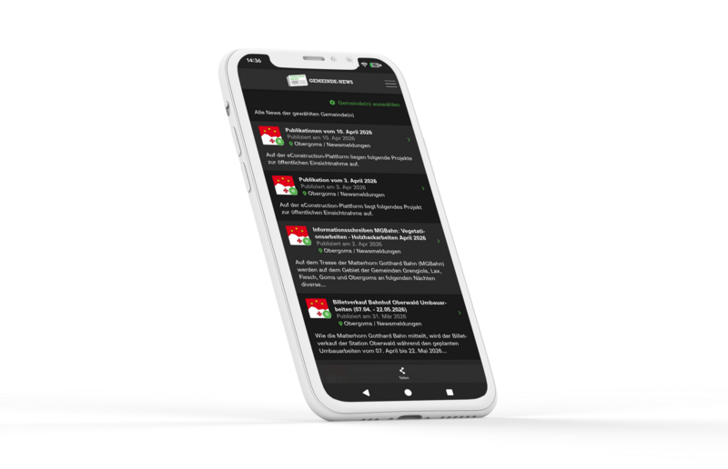Laden Sie die Gratis-App «Gemeinde News» im App Store oder bei Google Play oder auf der Website www.gemeinde-news.com herunter. Nach dem Download der App die Gemeinde «Obergoms» anwählen und Sie erhalten ab sofort alle News direkt auf Ihr Smartphone.